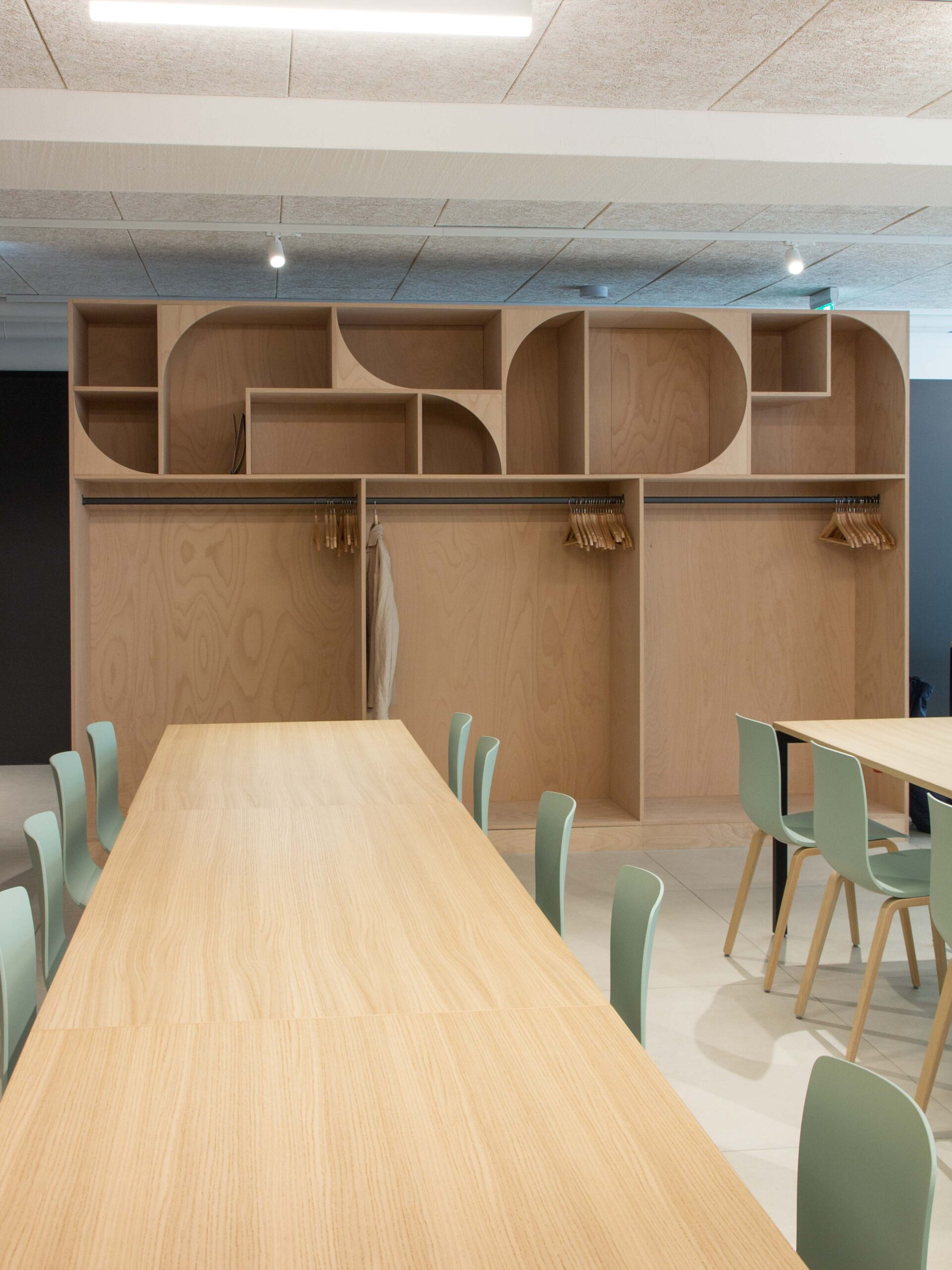 Regalwände und Garderobe aus Buchen-Sperrholz mit Viertelkreis-Elementen, Luzern