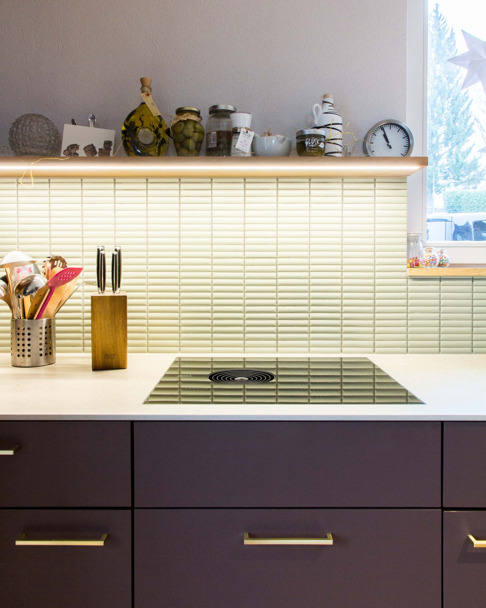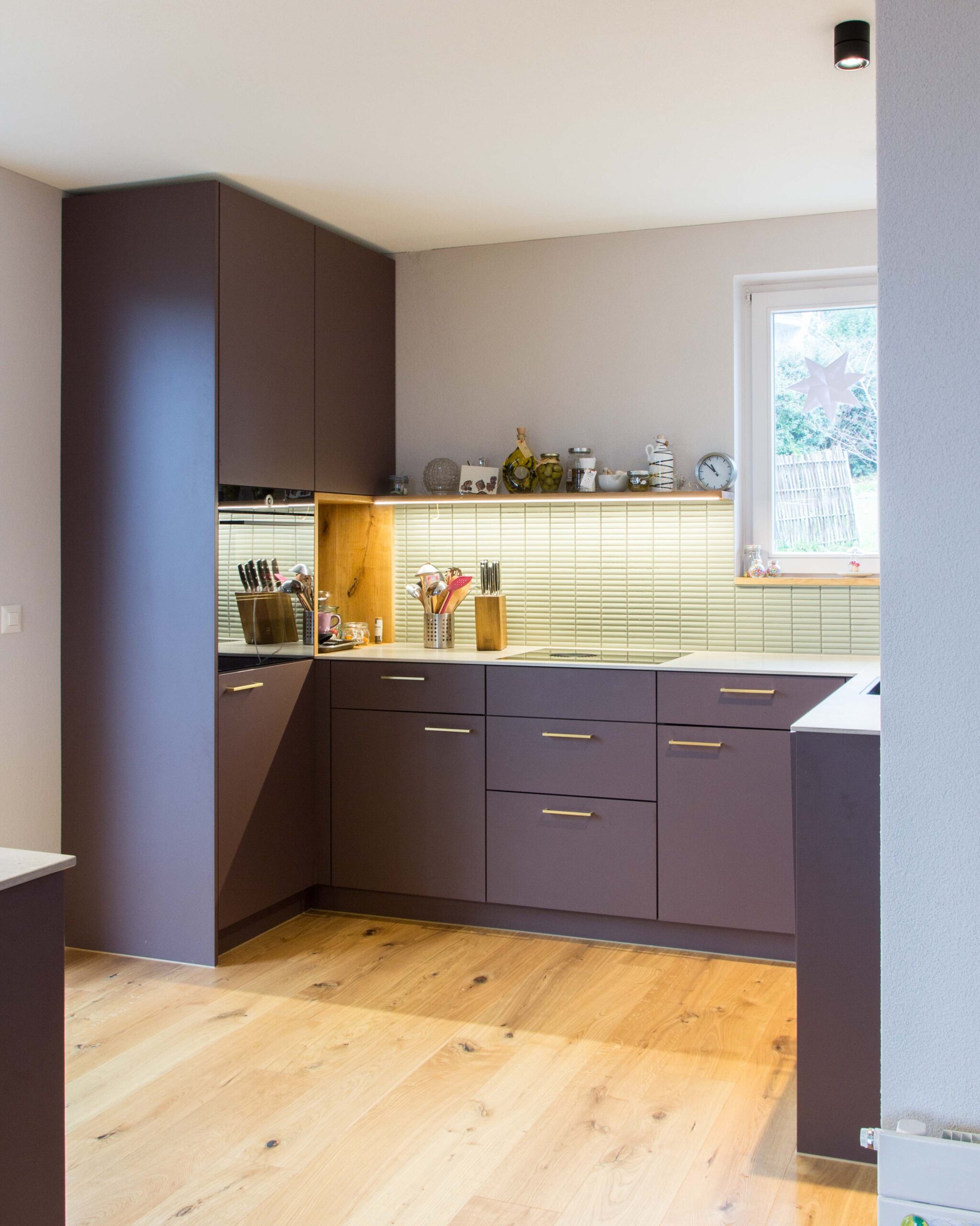 Die Küche wurde in mattviolettem Dekor umgesetzt und mit schmalen, pastellgrünen Platten kombiniert. Die Farben spielen gut mit dem Eichenparkettboden zusammen. Eine helle Arbeitsplatte und ein schlichtes Eichentablar oberhalb der Küchenkombination ergänzen das Gesamtbild. Messingfarbene Griffe und eine zusätzliche, frei stehende Arbeitsfläche in der Küche bieten Funktionalität, ergänzt durch den integrierten Dampfabzug im Kochfeld.