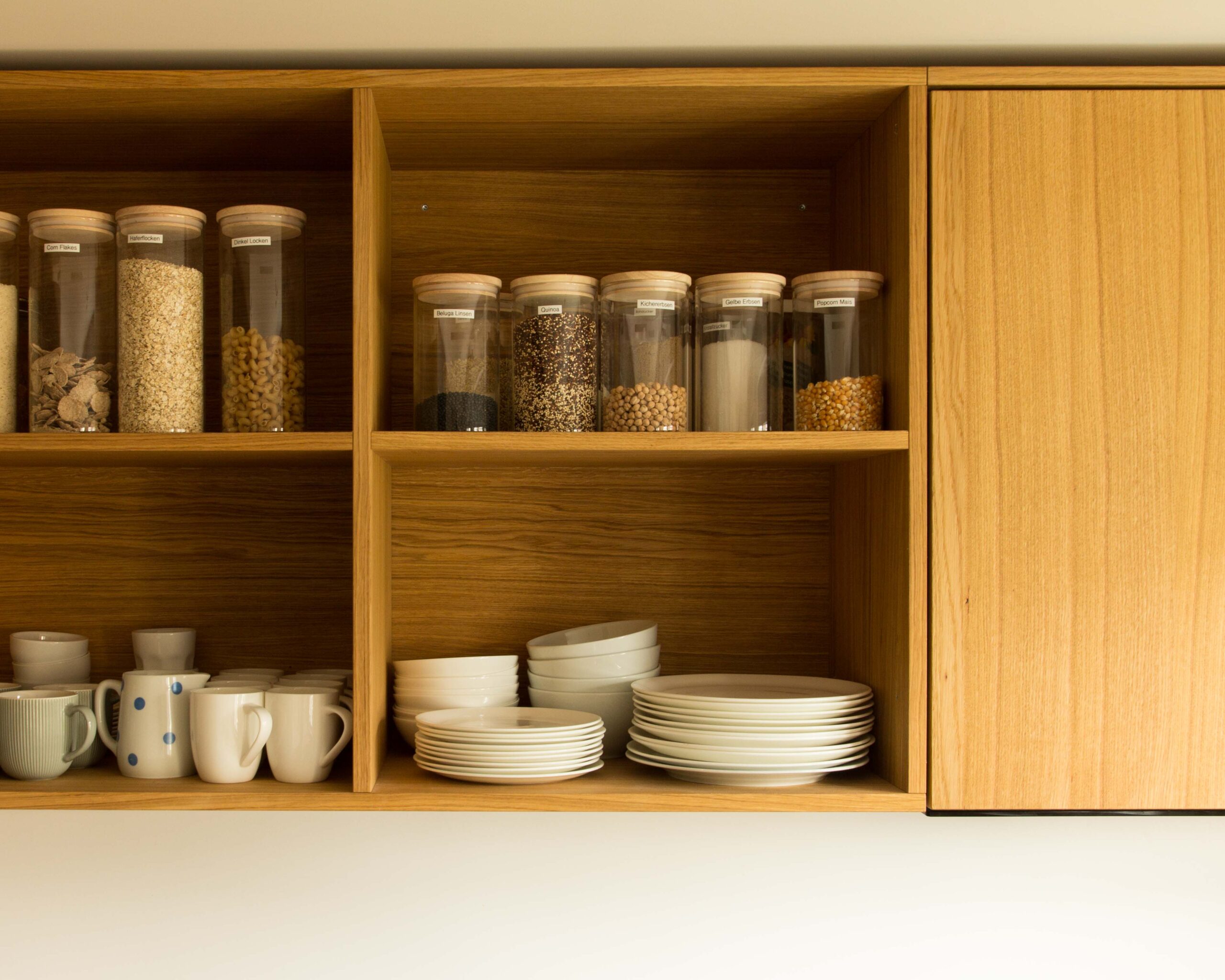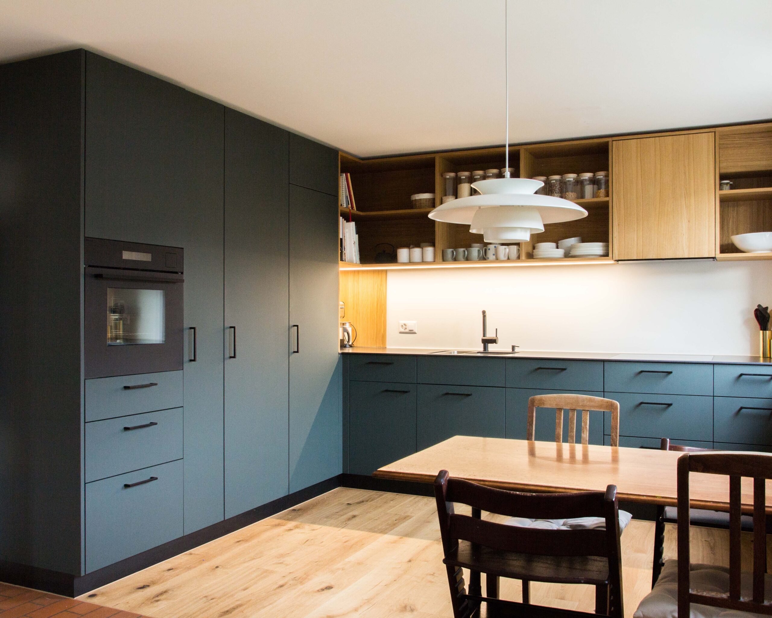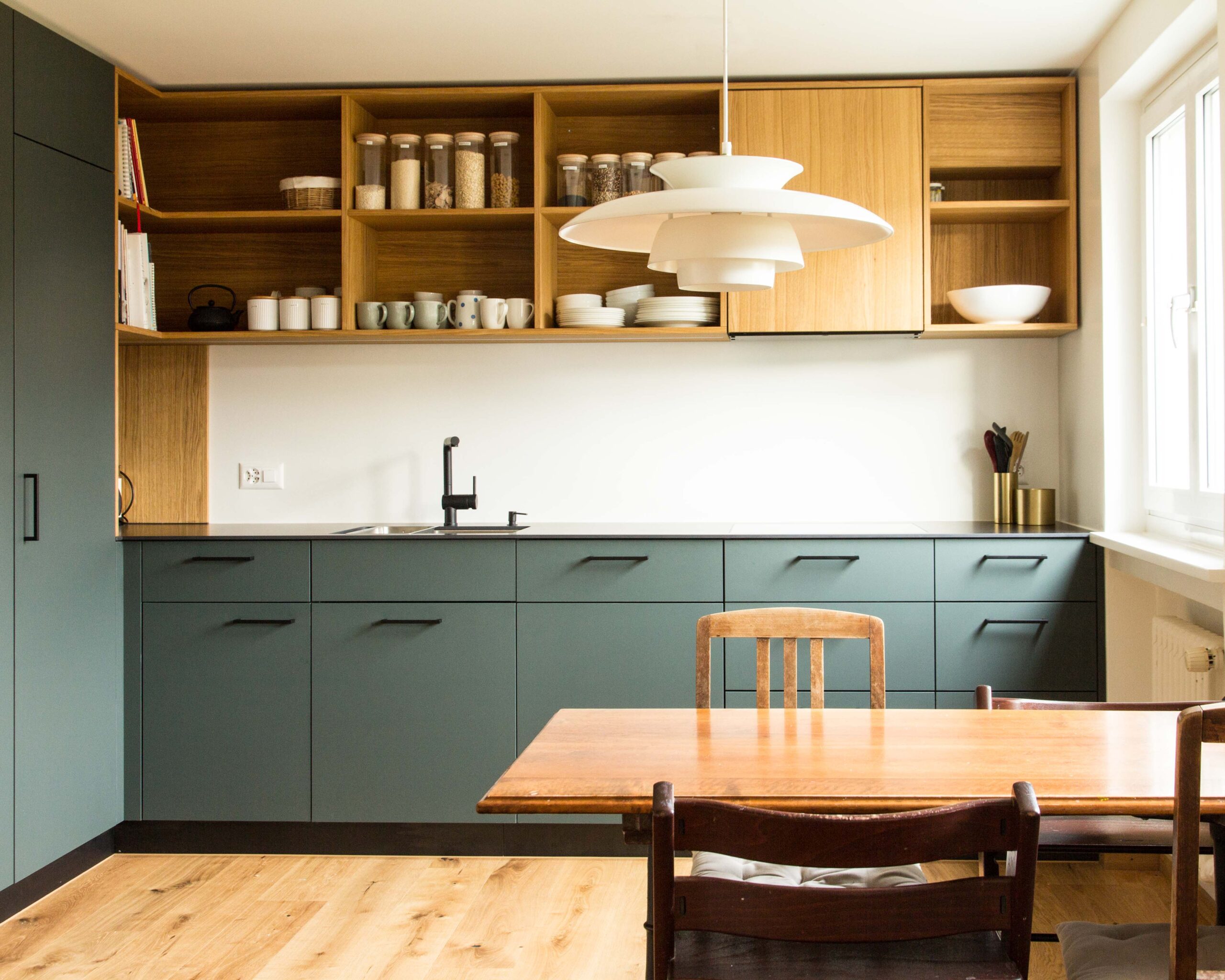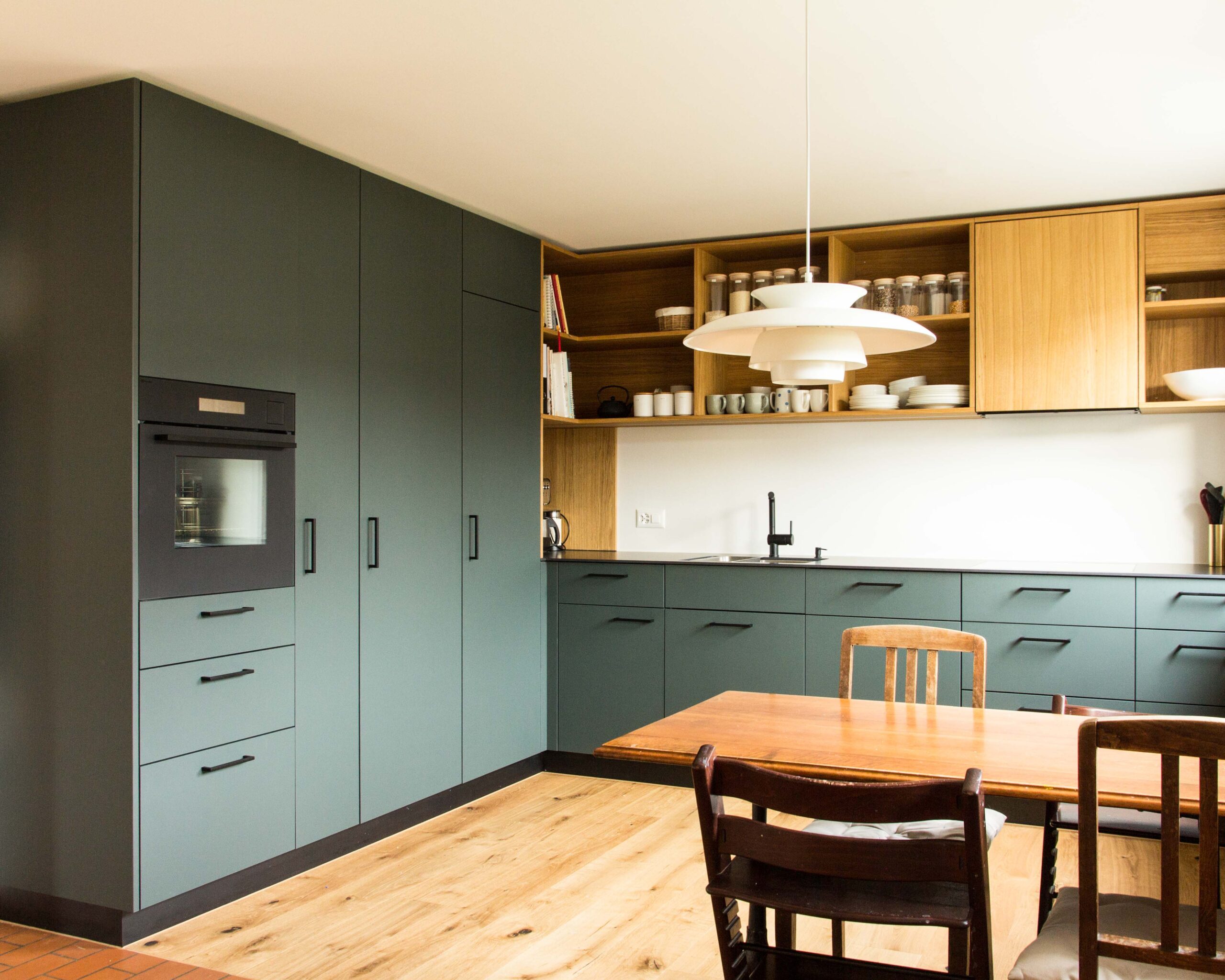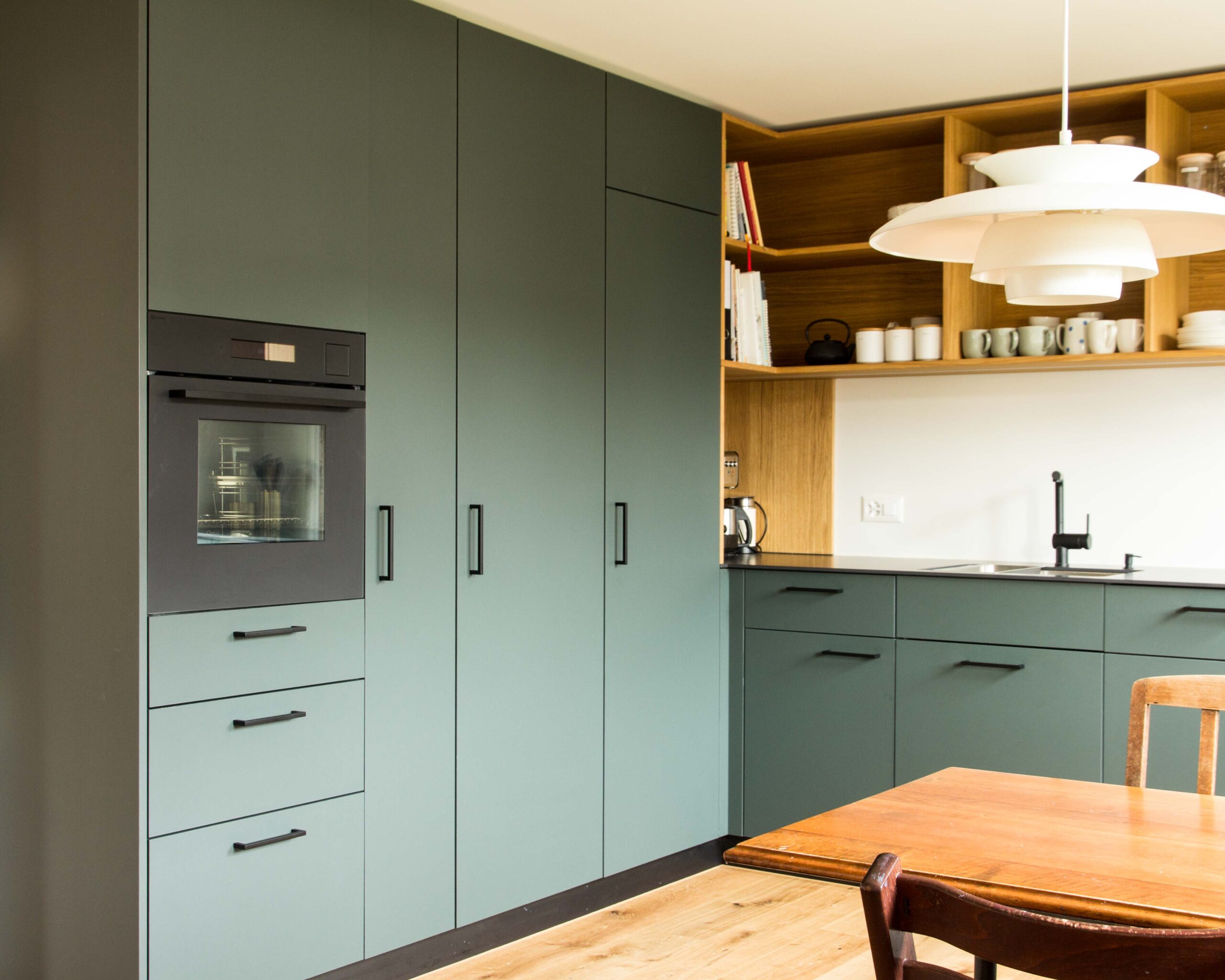Die matte Decorfarbe in Grau-Blau-Grün – ein bisschen wie Salbei, einfach eine Spur dunkler – schafft eine ruhige, warme Basis. Eichenakzente in Form von offenen Regalen, einem geschlossenen Element und einer Nische verbinden das Gesamtbild.