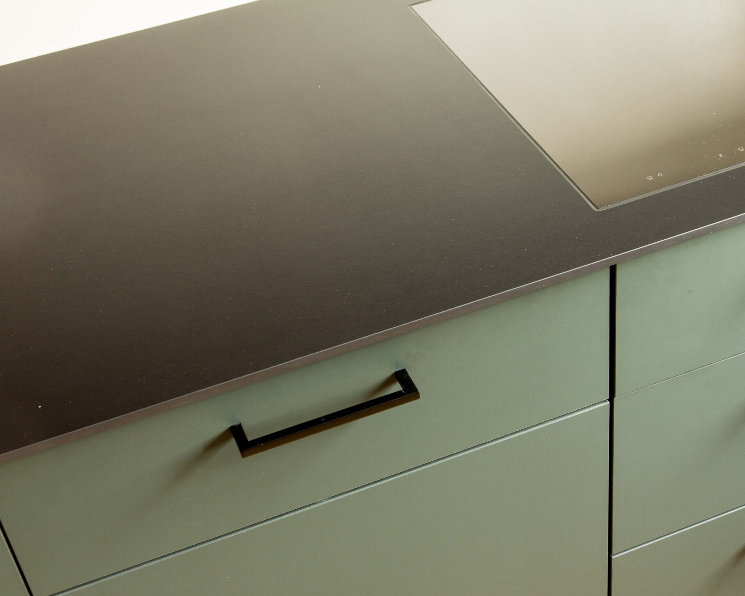 LED-Unterbeleuchtung sorgt für stimmiges Licht, während schwarze, eckige Metallgriffe und die anthrazitfarbene Abdeckung einen eleganten Kontrast setzen.